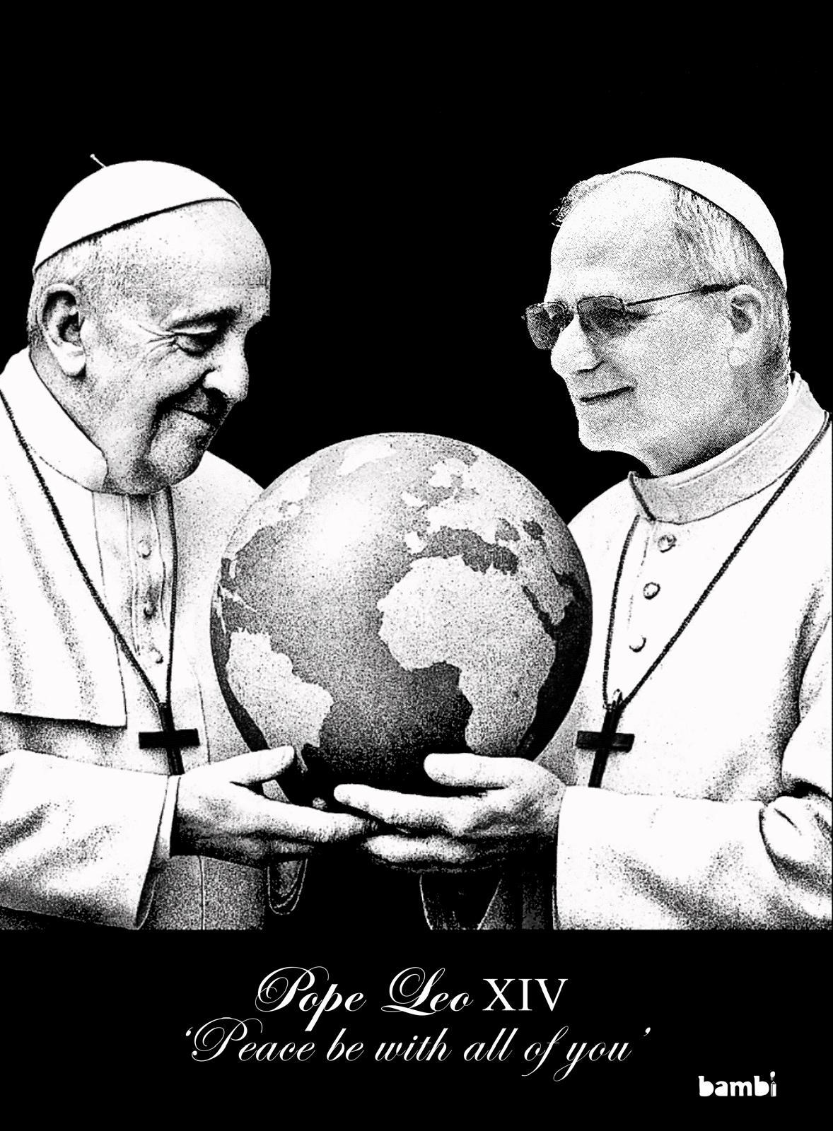 “Peace Be with All of You” depicts the moment when Pope Francis hands the world to the newly appointed Pope Leo XIV. This powerful gesture symbolizes the passing of the torch of Christ’s love and the ongoing mission to nurture and respect our planet as we journey into the future.-Bambi